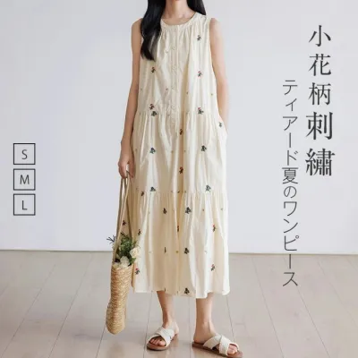 ワンピース 夏 レディース ティアード ワンピース ノースリーブ ワンピース ロング丈 刺繡 ノースリーブ ワンピース 大きいサイズ ロング丈 ワンピース 無袖 ゆったり 体型カバー