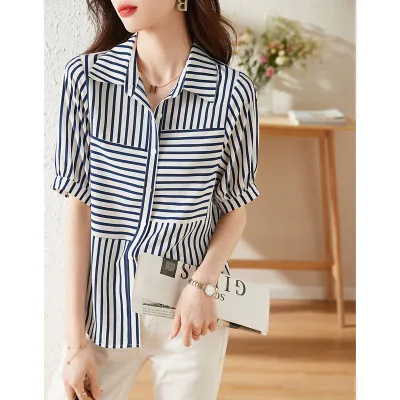 ストライプドッキングギャザーショートスリーブシャツ