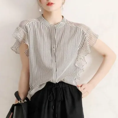 袖フリルストライプブラウス