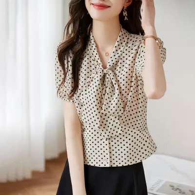 ドット シャツ パフスリーブ シルク シルク生地 レーシング 新作 レトロ レディース トップス