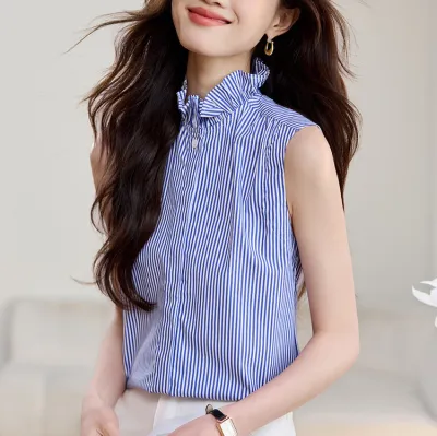 ソリッドカラーのフリル付き袖なしシャツ