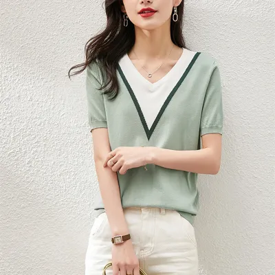 2025夏 新作 シンプルVネック半袖Tシャツ カラーコントラスト おしゃれ ニットトップス 女性用 スリム 肌馴染み良い