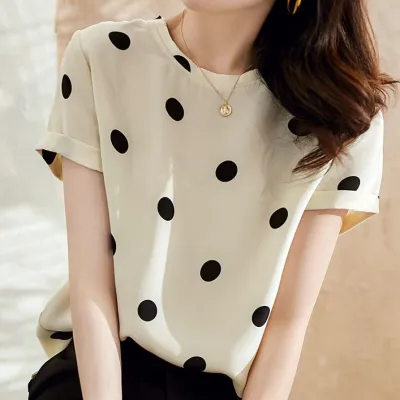 絶対欲しいシンプルドット柄プルオーバーラウンドネック半袖Tシャツホワイト白コーディネートカジュアルファッション着回しootd夏コーデ夏服レディース20代30代40代50代