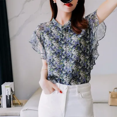 レディース チュニックトップス フローラルプリント シフォン風 巻き袖 キュート系