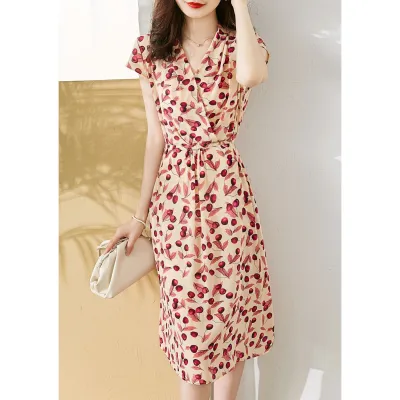 2025夏新作 チェリー柄サマードレス クロスネックライン ウエストシェイプ レトロデザイン 軽熟女向け ワンピース