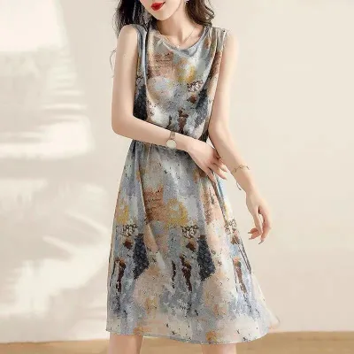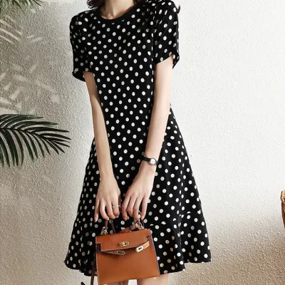 ドット 膝丈 ワンピース 半袖 スリムに見える 夏服 デザイン 普通 気質 新作 レトロ デザイン性 ニッチ カジュアルドレス