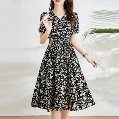 好印象MAX♡ プリント ボウタイ Aライン 花柄 半袖 ファッション デートワンピース