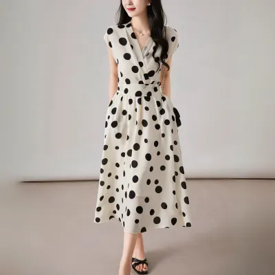 ポルカドット Vネック タイドレス ワンピース