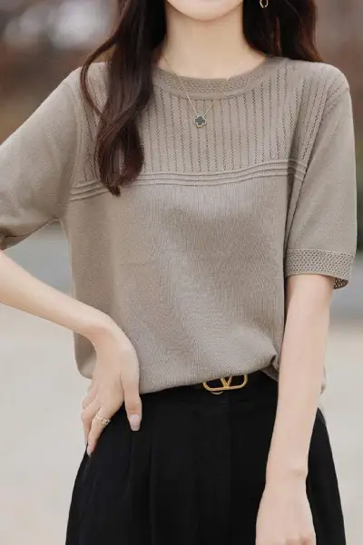 ゆったりラウンドネック ニット半袖Tシャツ