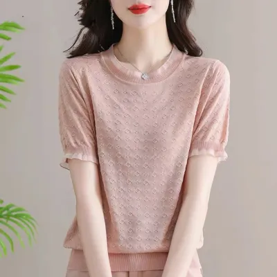Tシャツ シルク ニット ニットトップス シルク生地 半袖 ゆったり クルーネック 薄 気質 レディース