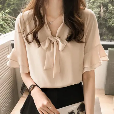 大人女子必見! リボン 無地 フレア袖 五分袖 ボウタイ エレガント シフォンシャツ 大人 ootd 夏コーデ 夏服 レディース ファッション 20代 30代 40代 50代 カジュアル コーディネート トレンド 着回し
