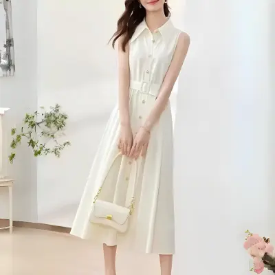 夏用・ノースリーブでウエストシェイプされたシンプル通勤スタイルのロングワンピース