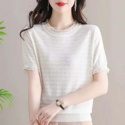 Tシャツ シルク ニット ニットトップス シルク生地 半袖 ゆったり クルーネック 薄 気質 レディース
