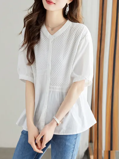 五分袖・夏の新作・綿100%クルーネックゆったりシャツトップス