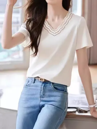 カジュアルアートVネック刺繍Tシャツ