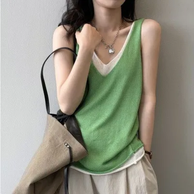 韓国人気新品 レイヤード / 重ね着風 配色 無地 Vネック ノースリーブ 森ガール Tシャツ 大人 ootd 夏コーデ 夏服 レディース ファッション 20代 30代 40代 50代 カジュアル コーディネート トレンド 着回し