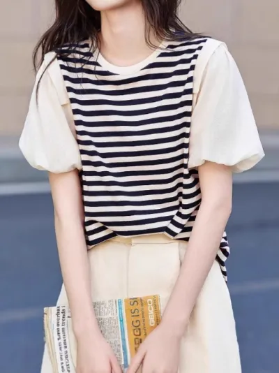 2025夏新作 ストライプパッチワーク半袖Tシャツ レディース 綿100% ゆったりルーズフィット ランタンスリーブ スリムシルエット トップス