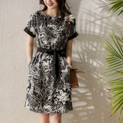 墨染めプリントベルテッドドレス